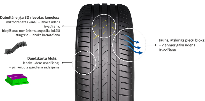 - Найкраща маневреність на поворотах на мокрій дорозі та відмінні характеристики на прямій у мокру погоду